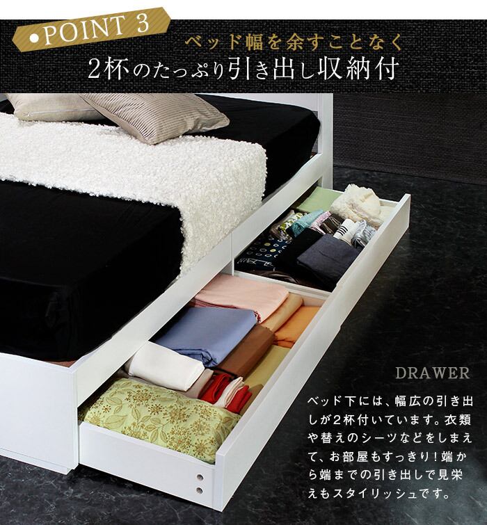 2杯の引き出しでたっぷりと収納でき、デッドスペースになりがちなベッド下を有効活用できます。