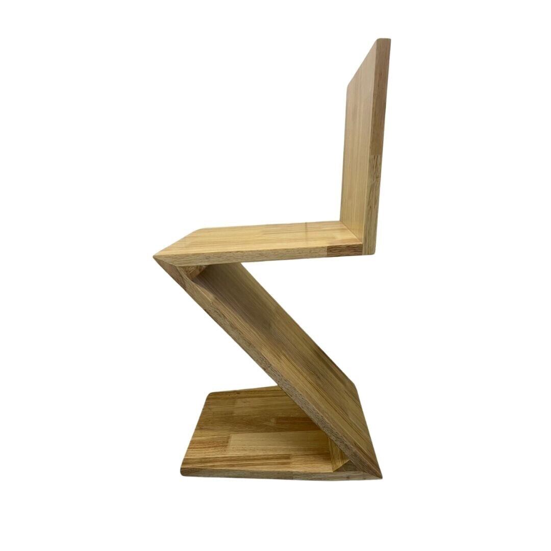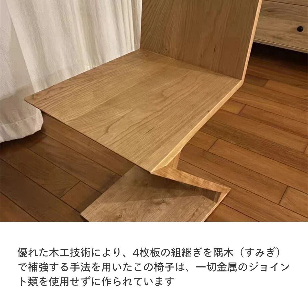 ジグザグチェアは、色使いや幾何学的・モンドリアン的デザインでデ・ステイルを代表する建築、シュレーダー邸のためにデザインされたものであり、リートフェルトの代表作でもあります。リートフェルトのデザインは、直線を利用し水平方向・垂直方向へ構成されたものが多数あります。このジグザグチェアはその名の通り「Z」の形をしており、このZを逆にしたような形は、背部・座部・支持部・底面の4つの木材がリズミカルに連なっています。