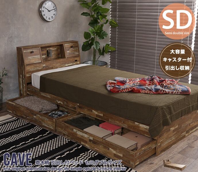 【セミダブル】Cave 寄木柄引出し付ベッド(フレームのみ)