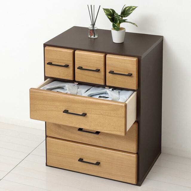 ◆引出しは大小各3杯付で小物から衣類までたっぷり収納できます。