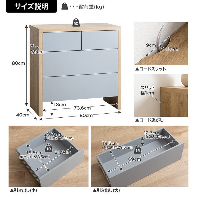 【耐荷重】天板:約50kg、引き出し(小):約10kg、引き出し(大):約15kg