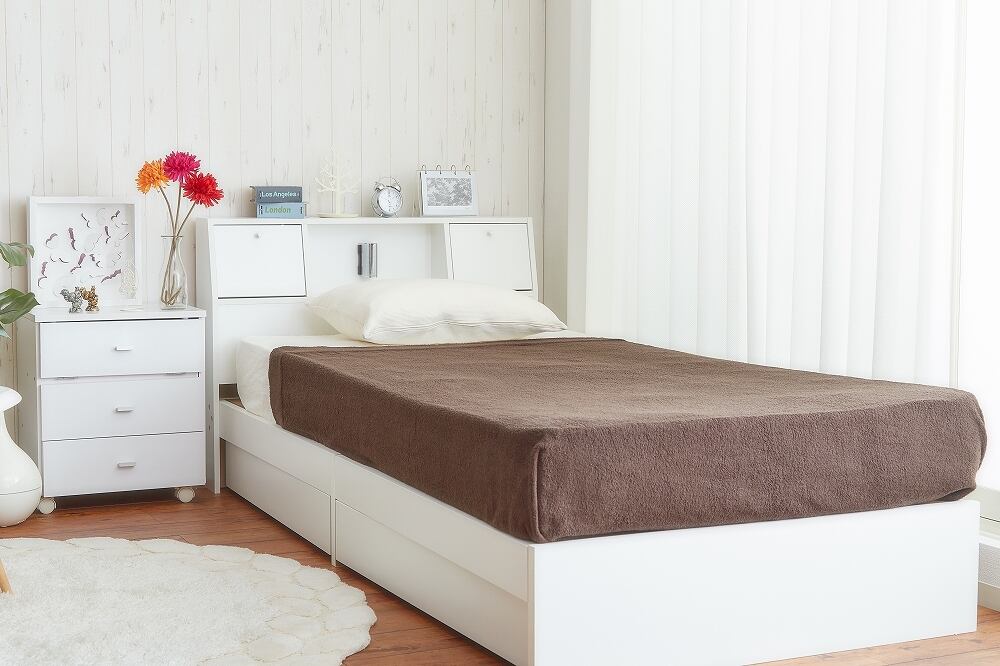 ヘッドボードに照明、コンセント、収納棚が付き、キャスター付の引出しまで付いた収納付ベッド。