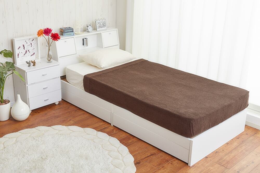ヘッドボードに照明、コンセント、収納棚が付き、キャスター付の引出しまで付いた収納付ベッド。