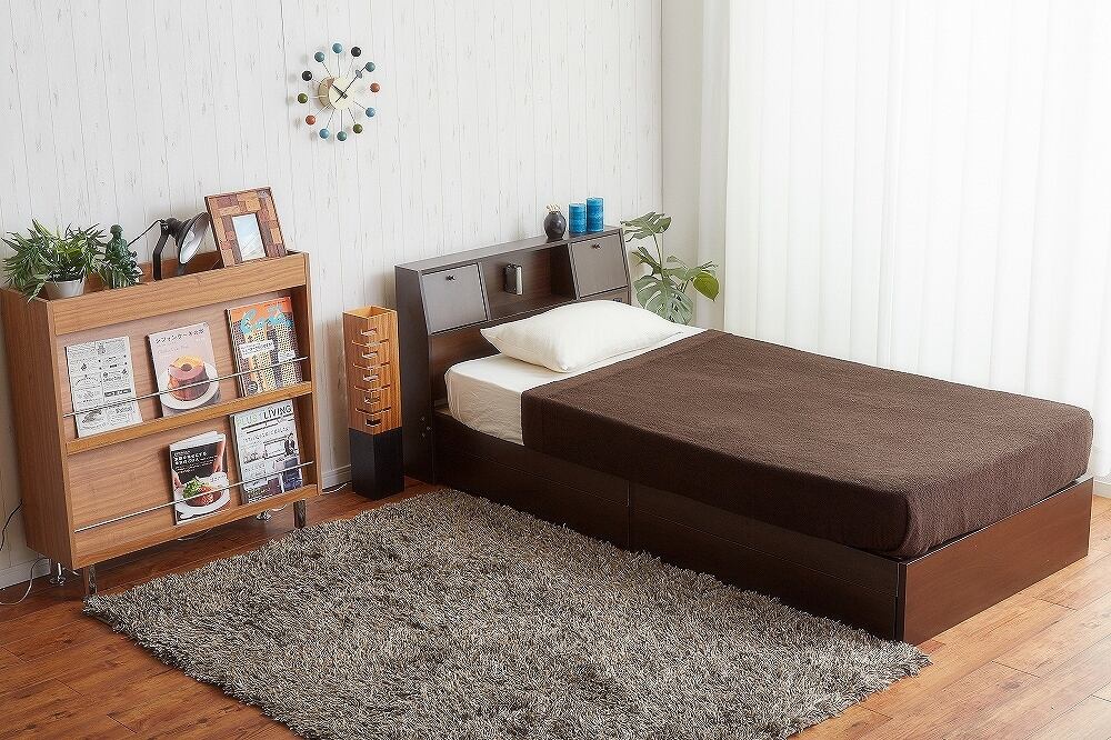 ヘッドボードに照明、コンセント、収納棚が付き、キャスター付の引出しまで付いた収納付ベッド。