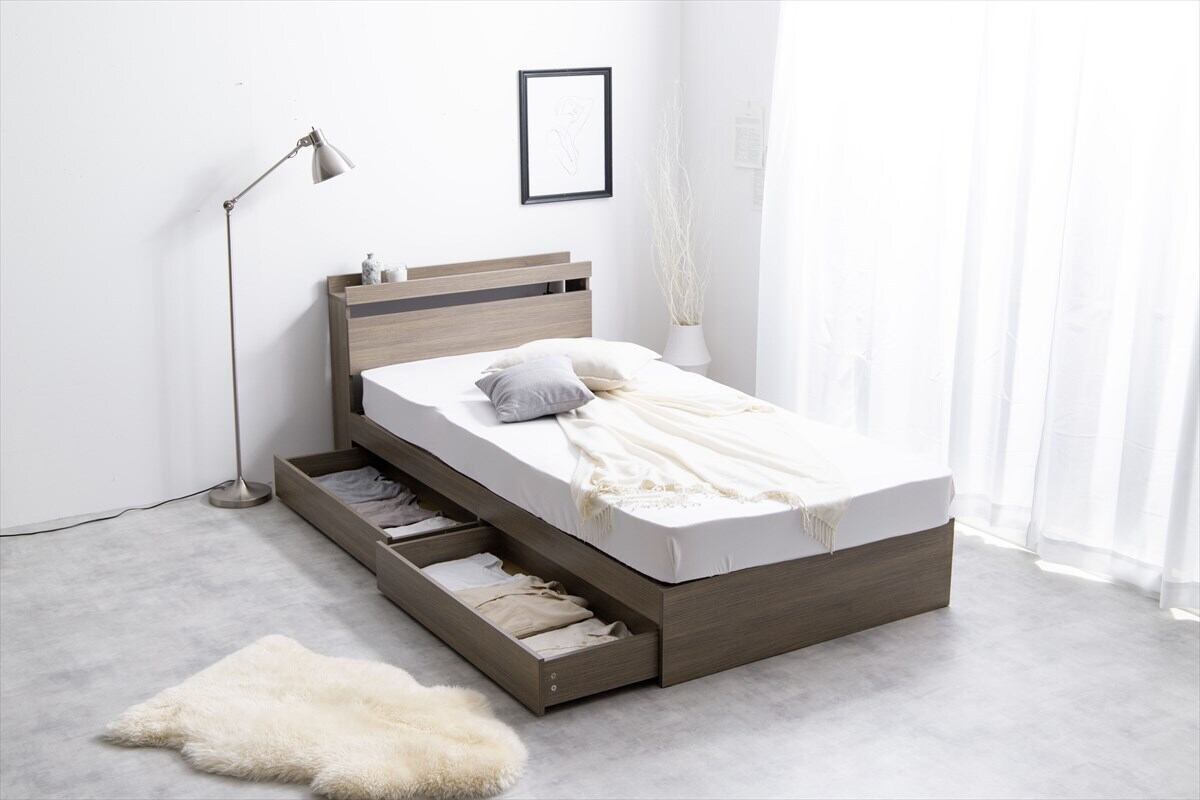 たっぷり収納付きベッド。便利な引出し収納が付いたシンプルなデザインの収納付きベッド。